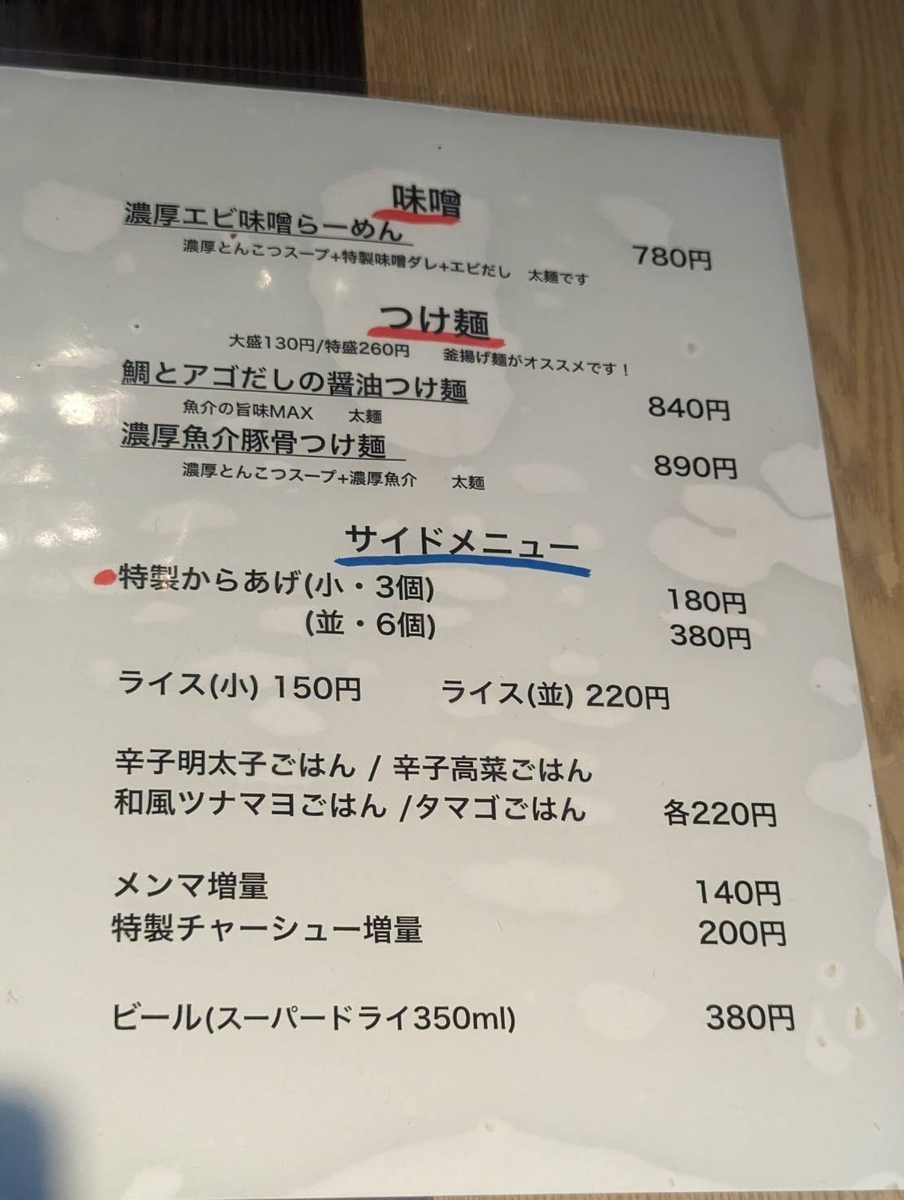 ラーメンの種類は塩、味噌、醤油、つけ麺があって、それぞれに2~3種類のメニューがあります。