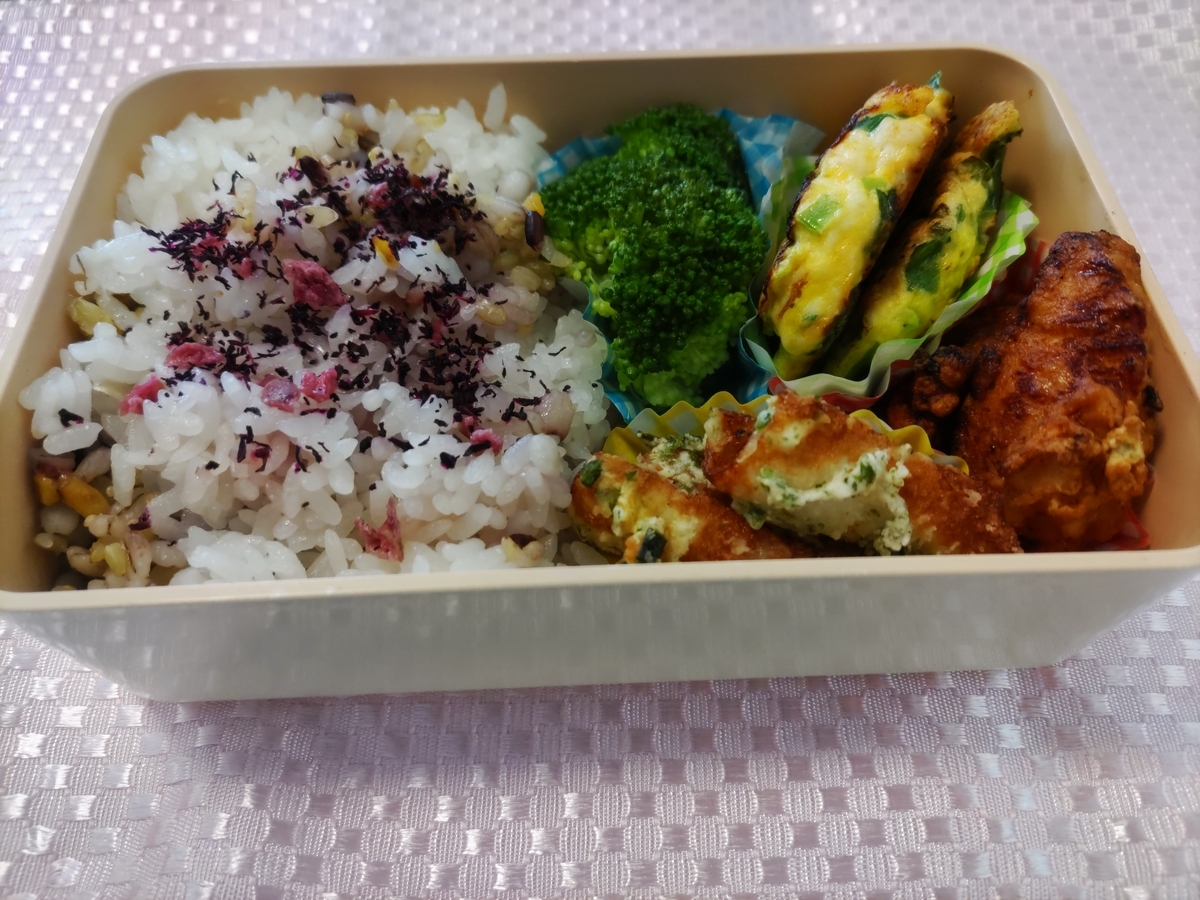 五穀米とゆかりふりかけ、ブロッコリーの塩ゆで、とり唐揚げ、ちくわの磯部揚げ、鳥ミンチのお好み焼き