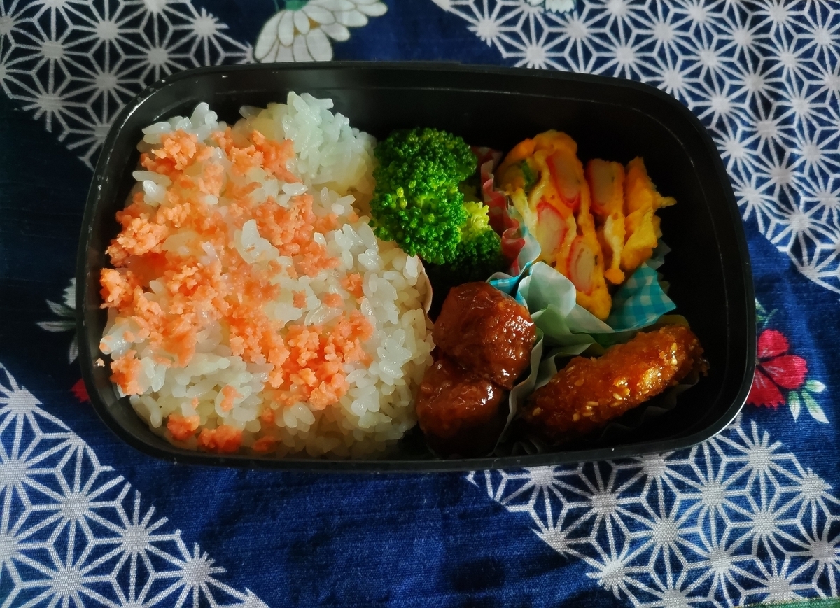 シャケフレークご飯、ブロッコリ、ミートボール、鶏肉の甘辛煮、かにかま入り卵焼き