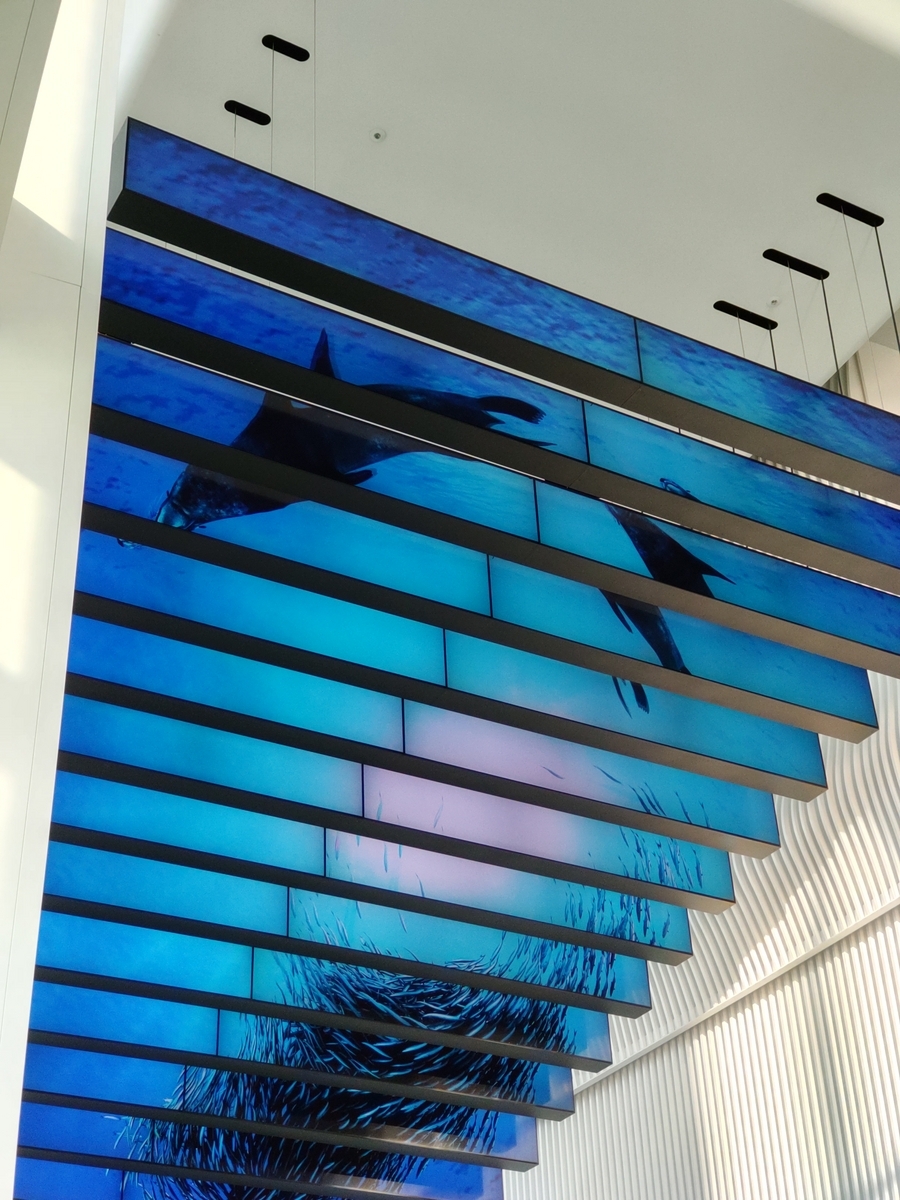 99階スターバックスコーヒーの入口に位置。天井に設置されたパネルからは様々な映像が流れるメディアアートが鑑賞できます。